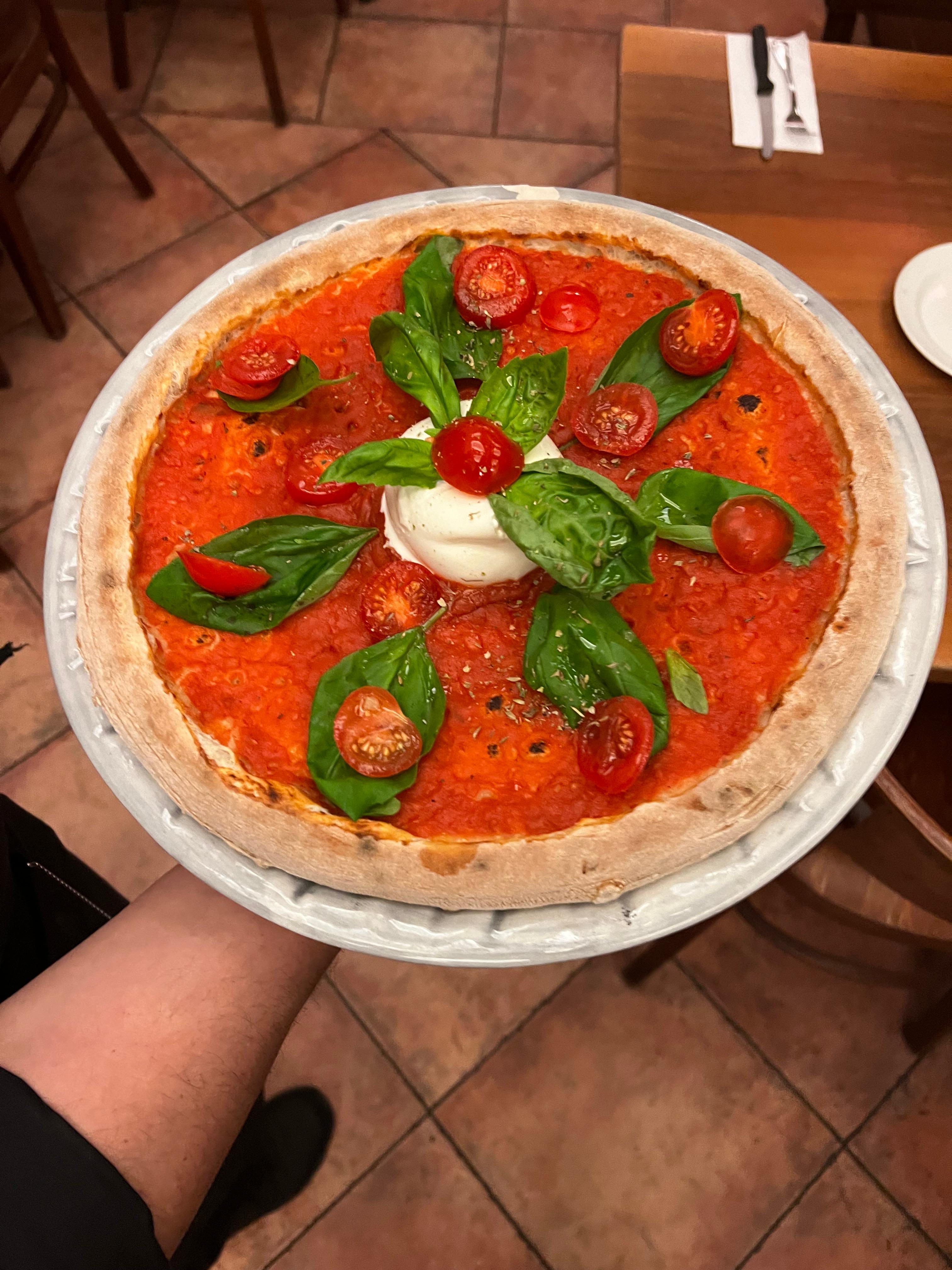 Tomatensauce, Mozzarella, Spinat und Gorgonzola.